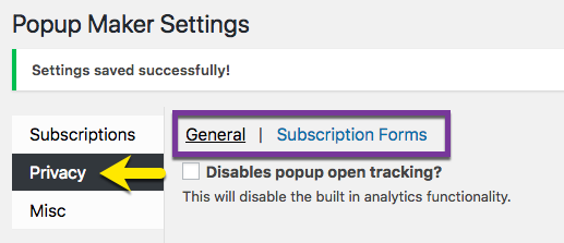 | 3 | Privacy | Disable popup analytics tracking. Manage label options using the Popup Maker Subscription Form shortcode. |