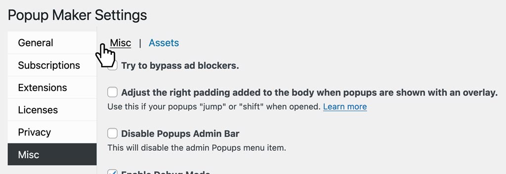 The Misc (miscellaneous) settings are divided into 2 categories; Misc and Assets.