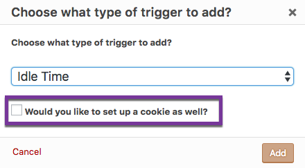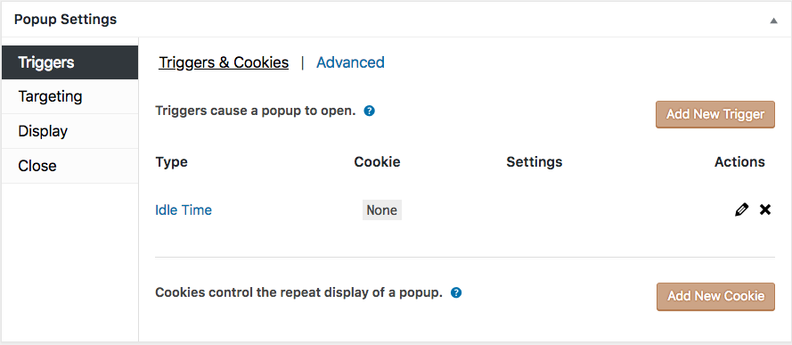 Either add a new popup, or edit an existing one. In the Popup Settings box, select the ‘Trigger’ tab and ‘Triggers & Cookies’ category. Select the ‘Add New Trigger’ button (or edit an existing trigger) and set a new Idle Time trigger. Save or update the trigger. Do not set nor link a cookie to this trigger.