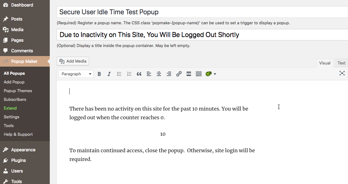 The Secure Logout Prompt shortcode option adds a countdown timer to the Popup Editor (Visual tab). By itself, the counter lacks any context when displayed to a site visitor.