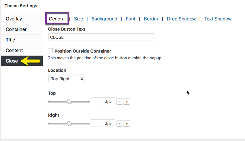 The Close option tab controls the styling of the popup close button. The General category controls the button text and style, and the placement of the button either within the popup container or the browser window.