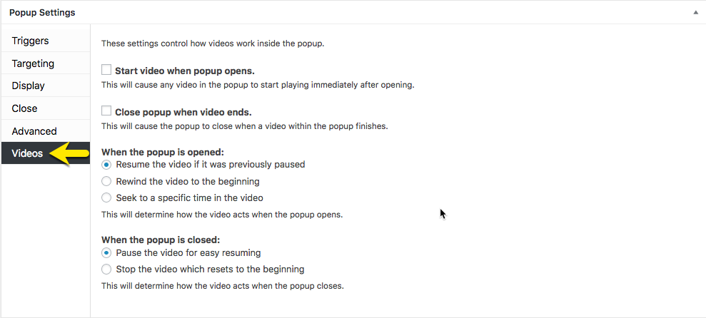 - Resume the video if it was previously paused ( default ) — If a visitor starts a video and closes the popup while the video is playing, it will resume playing when the popup is reopened.